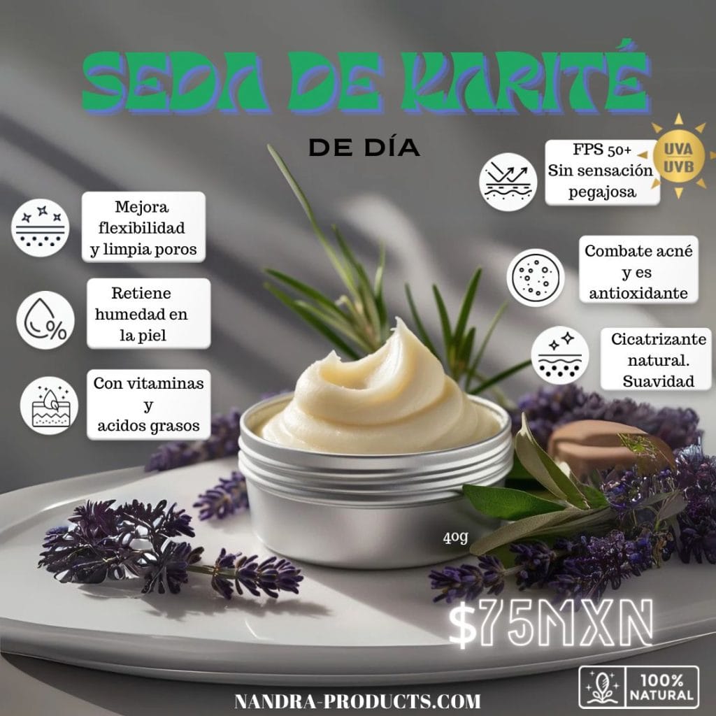 La Seda de karité de Día, te permite hidratar tu piel sin dejar en descuido del sol, además de ello, te ofrece una amplia gama de beneficios dentro de los cuales destacan: permite limpiar los poros al momento de su aplicación, mejora la flexibilidad de la piel permitiendo tener una mejor textura, llena de vitaminas y ácidos grasos, combate acné y es un perfecto antioxidante 100% natural, con su propiedad de cicatrizante natural, te otorga una suavidad en la piel única, dejándote un cutis de «pompis de bebé».