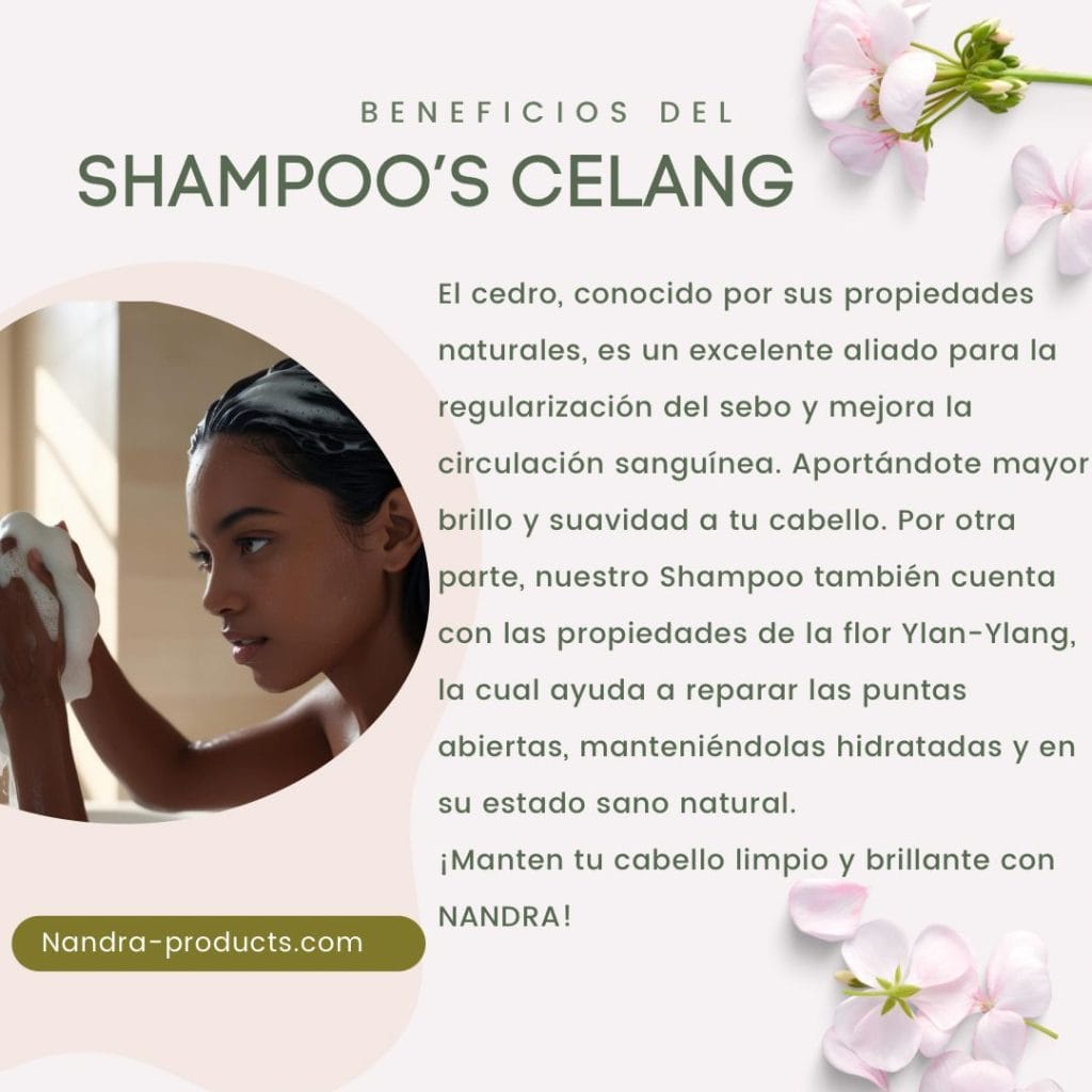 - Propiedades antioxidantes: Los antioxidantes presentes en el shampoo’s celang, ayudan a proteger el cabello de los daños causados por los radicales libres, como la contaminación y la exposición al sol.